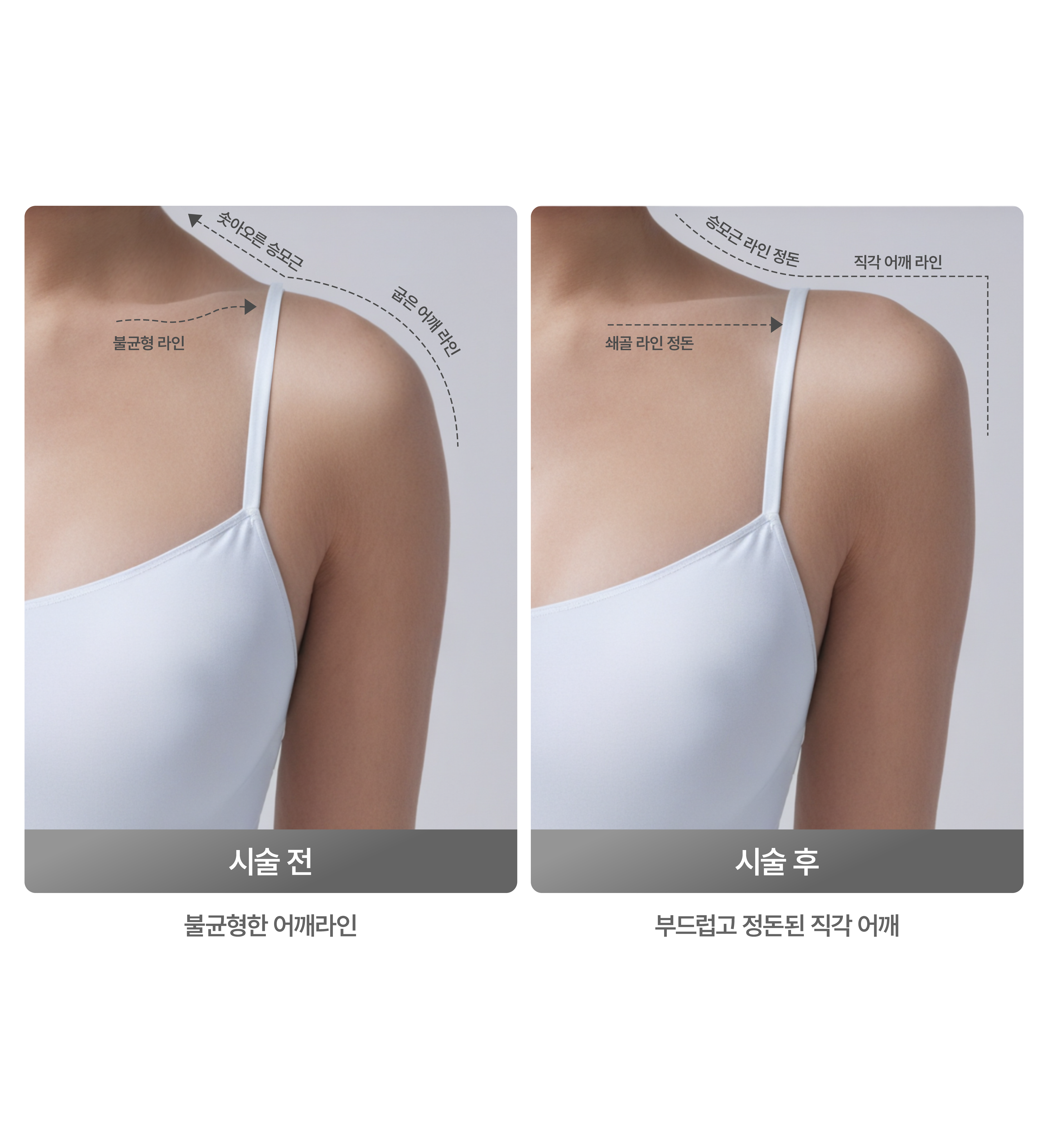 A. 승모근이 발달해 있다면 승모근 보톡스를 병행 할 수 있고, 두꺼운 팔뚝이나 처진 팔뚝이 고민이라면 팔 지방흡입 등을 함께 병행할 수도 있습니다. 시술을 진행하는 성형외과 전문의와 상담 후 병행 시술을 함께 결정하시는 것을 추천드립니다.